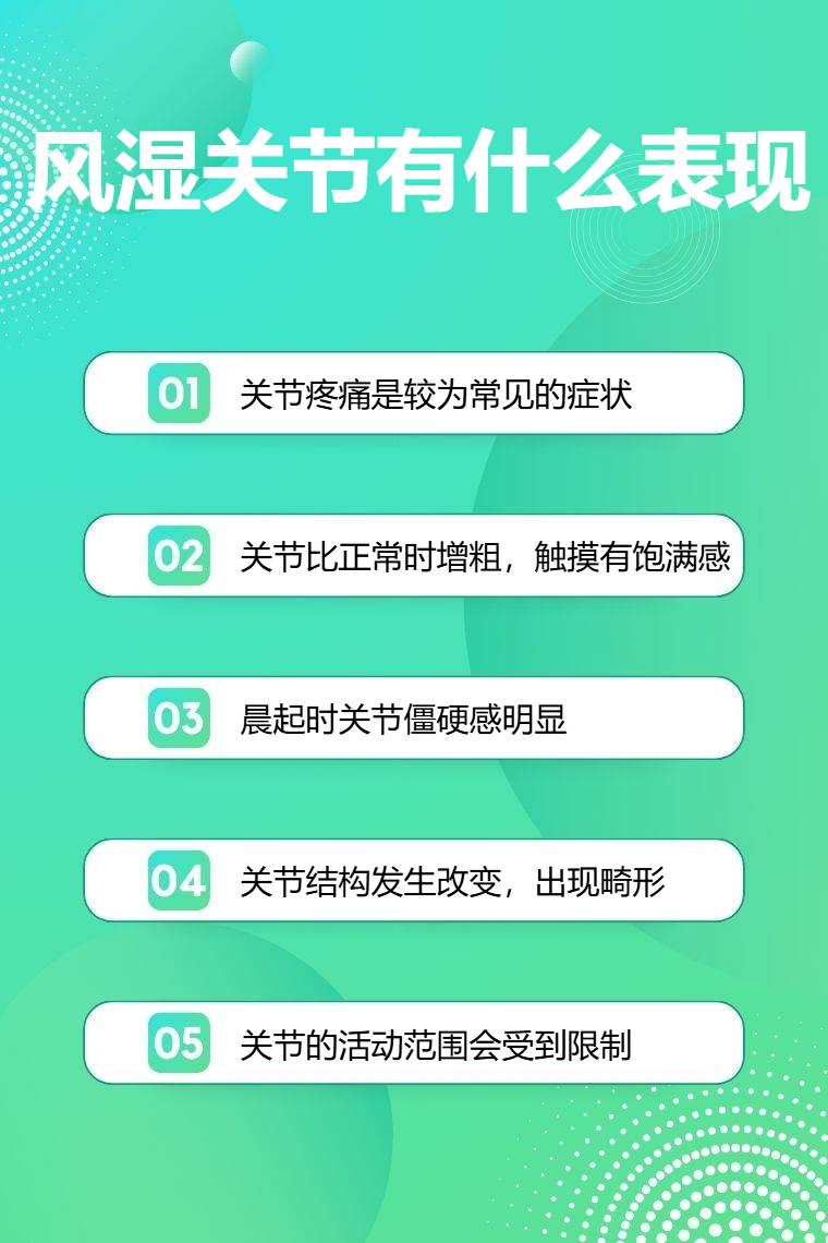 风湿关节的表现有关节疼痛、肿胀、僵硬、畸形、活动受限等。