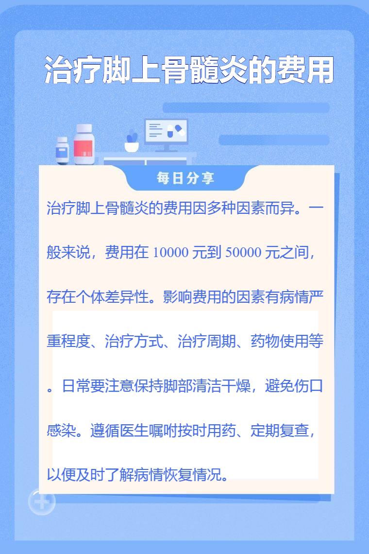 治疗脚上骨髓炎的费用因多种因素而异。一般来说,费用在 10000 元到 50000 元之间,存在个体差异性。影响费用的因素有病情严重程度、治疗方式、治疗周期、药物使用等。