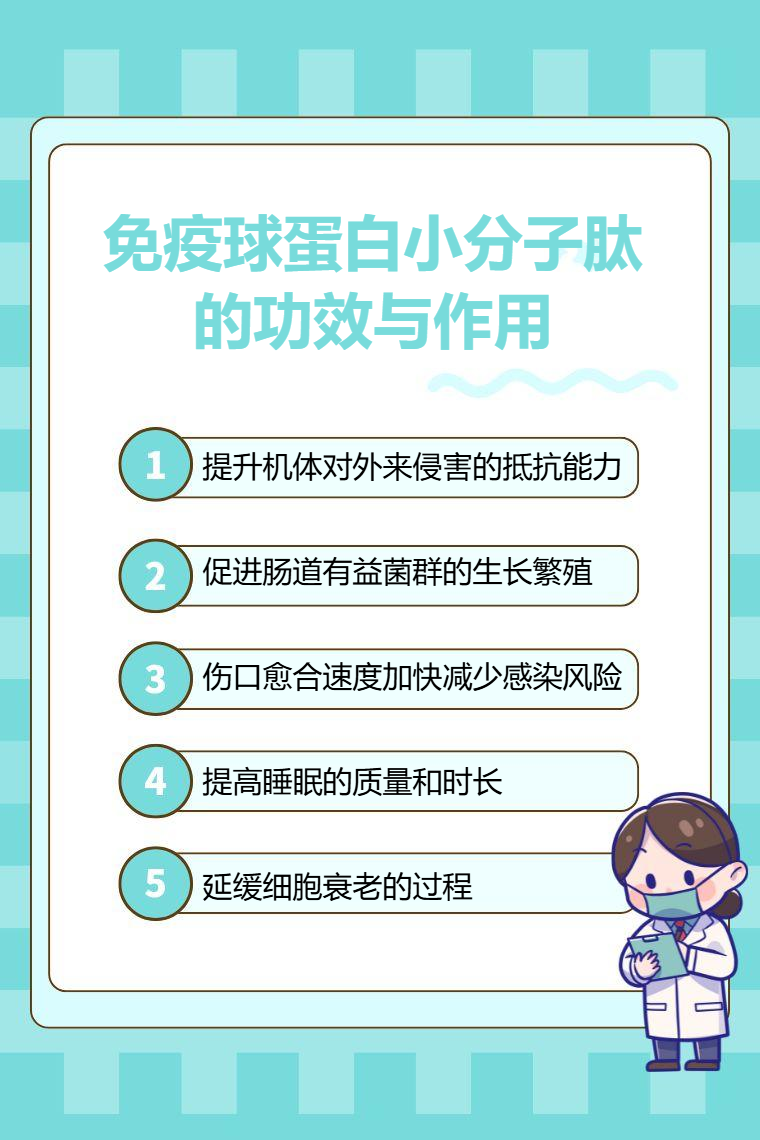免疫球蛋白小分子肽具有增强免疫力、调节肠道功能、促进伤口愈合、改善睡眠质量、抗氧化等功效与作用。