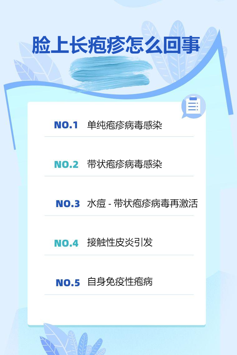脸上长疱疹通常由单纯疱疹病毒感染、带状疱疹病毒感染、水痘 - 带状疱疹病毒再激活、接触性皮炎引发、自身免疫性疱病等因素引起。