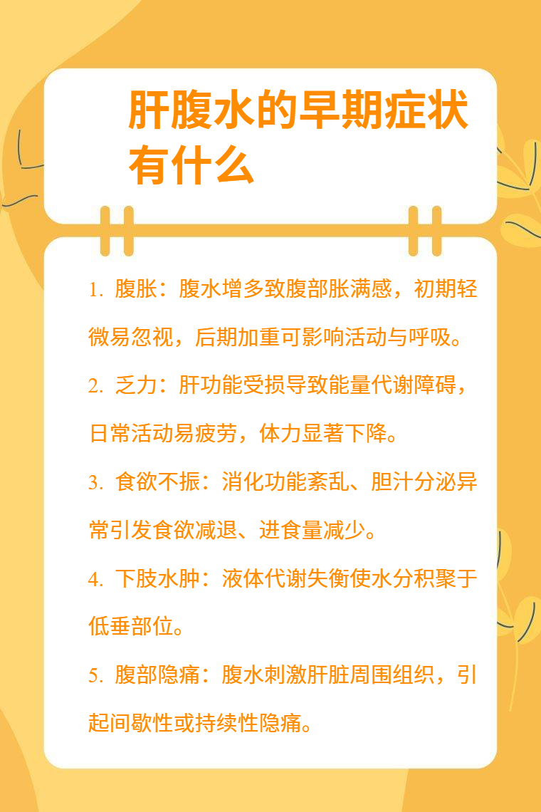 肝腹水早期症状有腹胀、乏力、食欲不振、下肢水肿、腹部隐痛等。