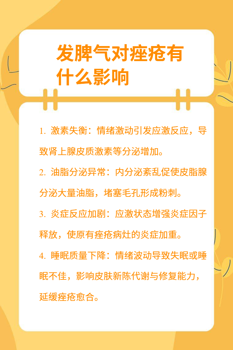 发脾气对痤疮的影响包括激素失衡、油脂分泌异常、炎症反应加剧、睡眠质量下降等。