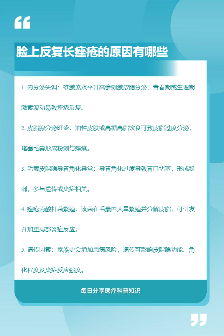 脸上反复长痤疮的原因有内分泌失调、皮脂腺分泌旺盛、毛囊皮脂腺导管角化异常、痤疮丙酸杆菌繁殖、遗传因素等。
