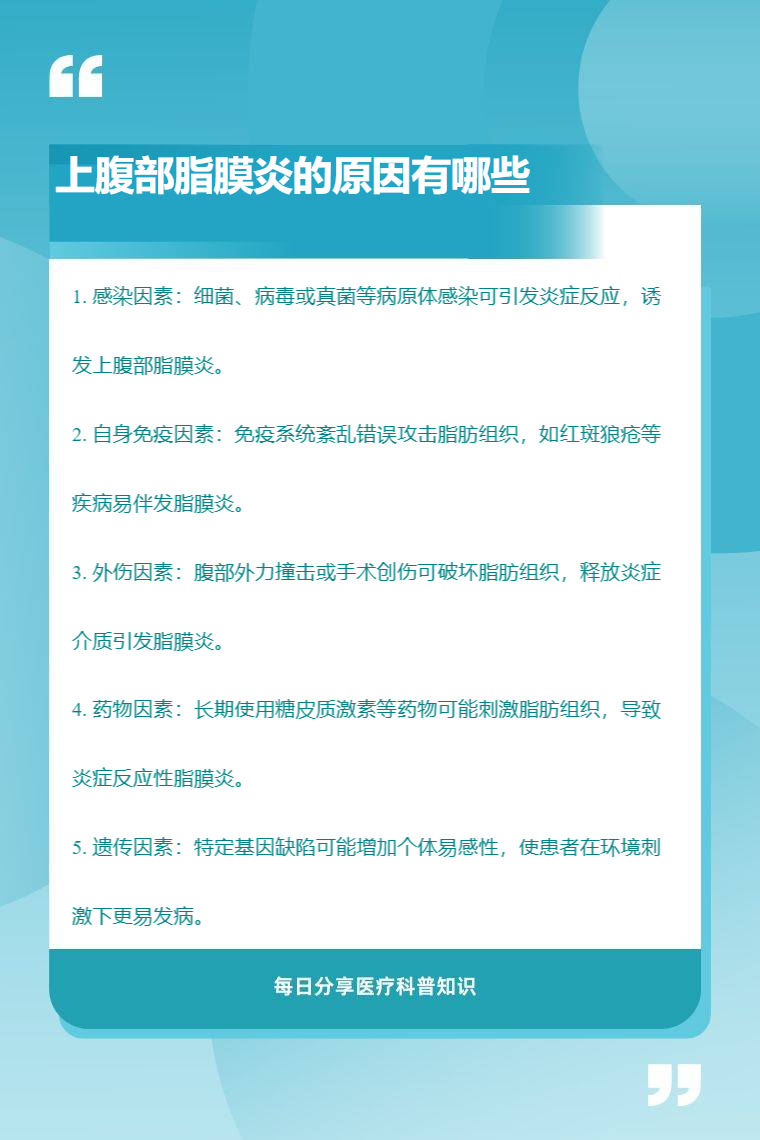 上腹部脂膜炎的原因有感染因素、自身免疫因素、外伤因素、药物因素、遗传因素等。