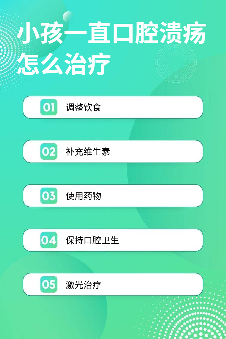 小孩一直口腔溃疡可通过调整饮食、补充维生素、使用药物、保持口腔卫生、激光治疗等方法来治疗。