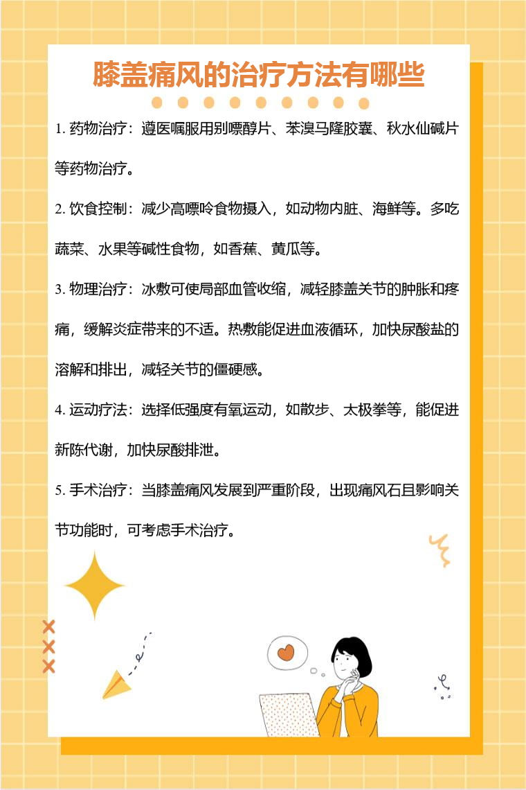 膝盖痛风的治疗方法有药物治疗、饮食控制、物理治疗、运动疗法、手术治疗等。