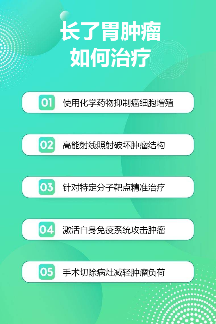 长了胃肿瘤可通过化疗、放疗、靶向治疗、免疫治疗、手术治疗等方法进行应对。
