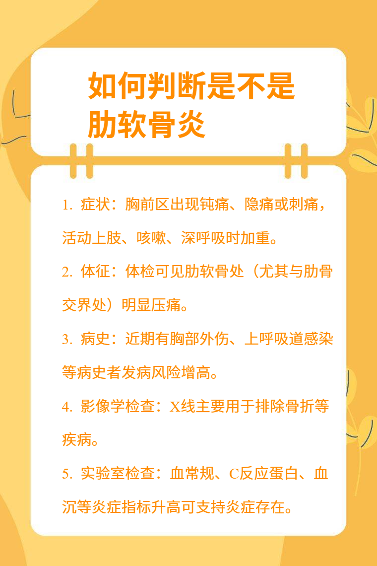 判断是否为肋软骨炎可从症状、体征、病史、影像学检查、实验室检查等方面入手。