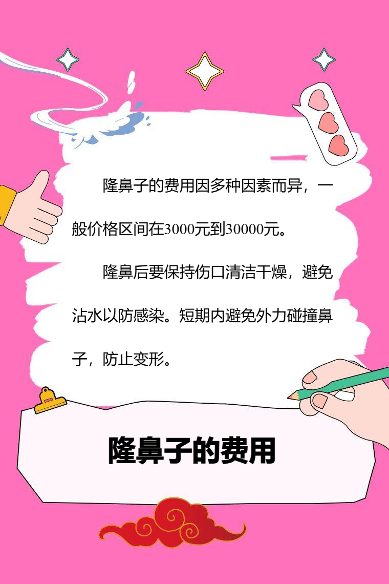 隆鼻子的费用因多种因素而异,一般价格区间在3000元到30000元,存在个体差异性。影响费用的因素有材料选择、手术难度、医生经验、地区差异等。