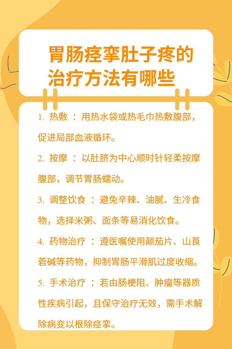 胃肠痉挛肚子疼的治疗方法有热敷、按摩、调整饮食、药物治疗、手术治疗等。