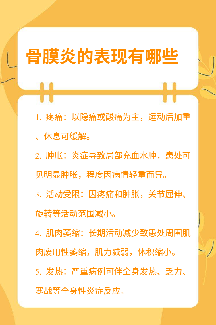 骨膜炎的表现有疼痛、肿胀、活动受限、肌肉萎缩、发热等。