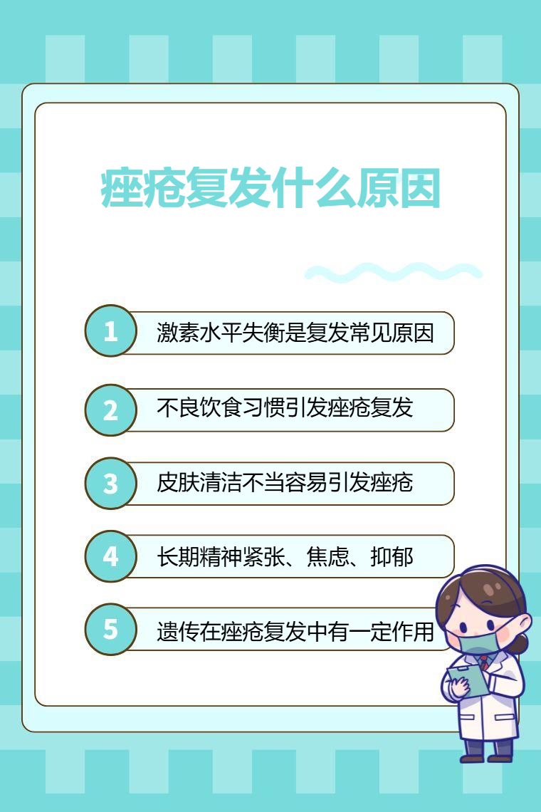 痤疮复发的原因包括内分泌失调、不良饮食习惯、皮肤清洁不当、精神压力过大、遗传因素等。