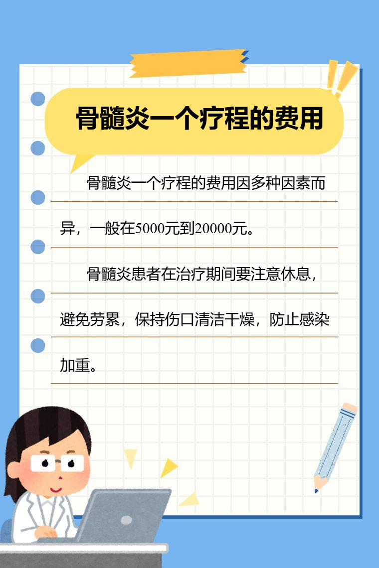 骨髓炎一个疗程的费用因多种因素而异,一般在5000元到20000元,存在个体差异性。影响费用的因素有病情严重程度、治疗方式、用药种类、治疗周期等。