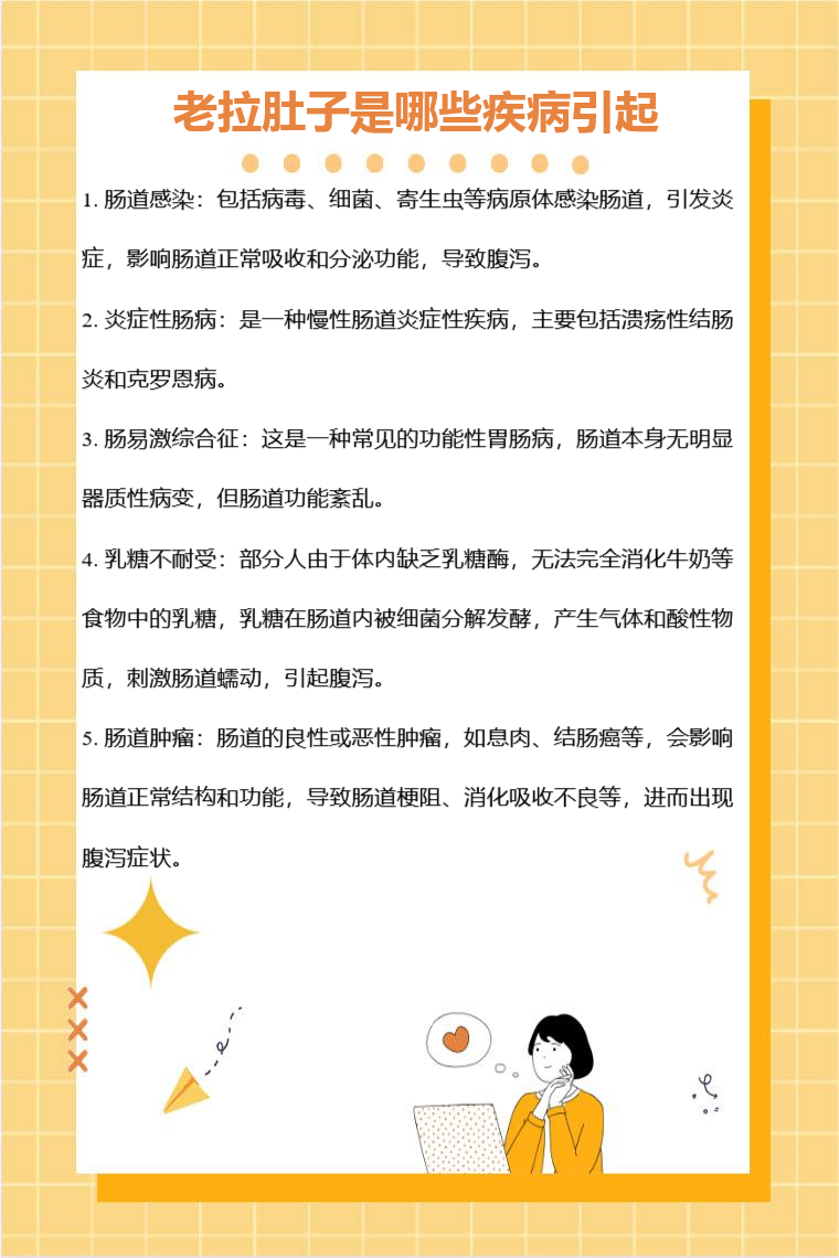 老拉肚子可能由肠道感染、炎症性肠病、肠易激综合征、乳糖不耐受、肠道肿瘤等引起。