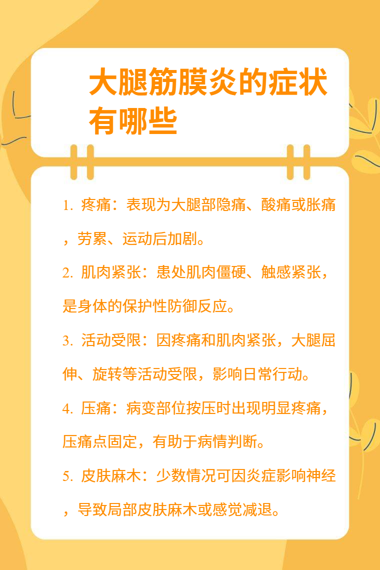 大腿筋膜炎的症状有疼痛、肌肉紧张、活动受限、压痛、皮肤麻木等。