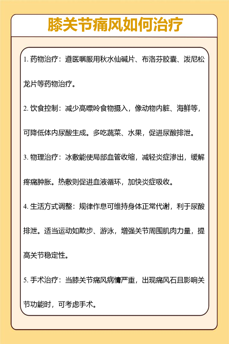 膝关节痛风的治疗方法包括药物治疗、饮食控制、物理治疗、生活方式调整、手术治疗等。