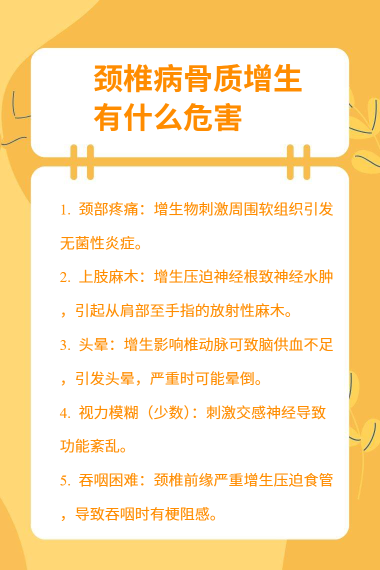 颈椎病骨质增生的危害有颈部疼痛、上肢麻木、头晕、视力模糊、吞咽困难等。