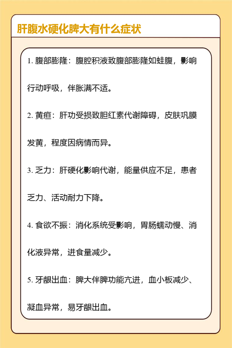 肝腹水硬化脾大的症状有腹部膨隆、黄疸、乏力、食欲不振、牙龈出血等。