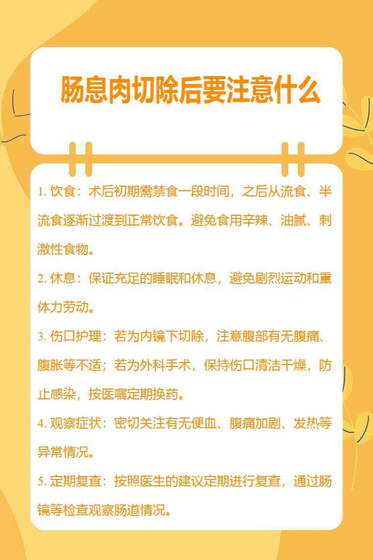 肠息肉切除后要注意饮食、休息、伤口护理、观察症状、定期复查等。