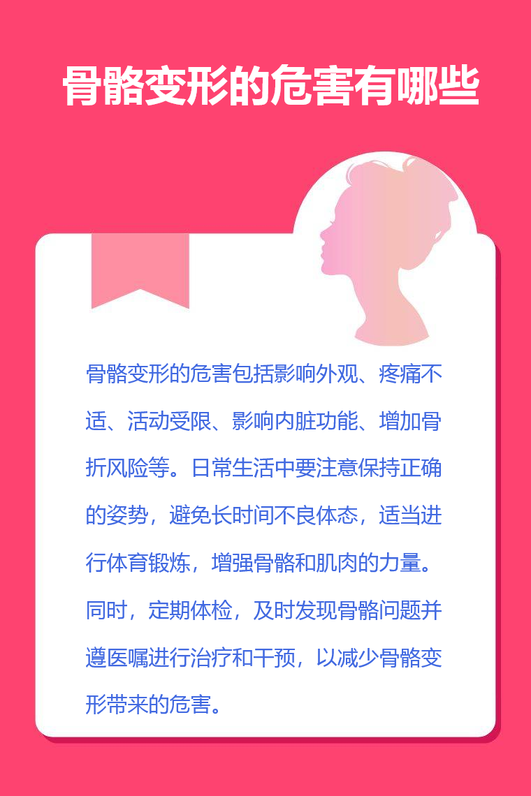 骨骼变形的危害包括影响外观、疼痛不适、活动受限、影响内脏功能、增加骨折风险等。