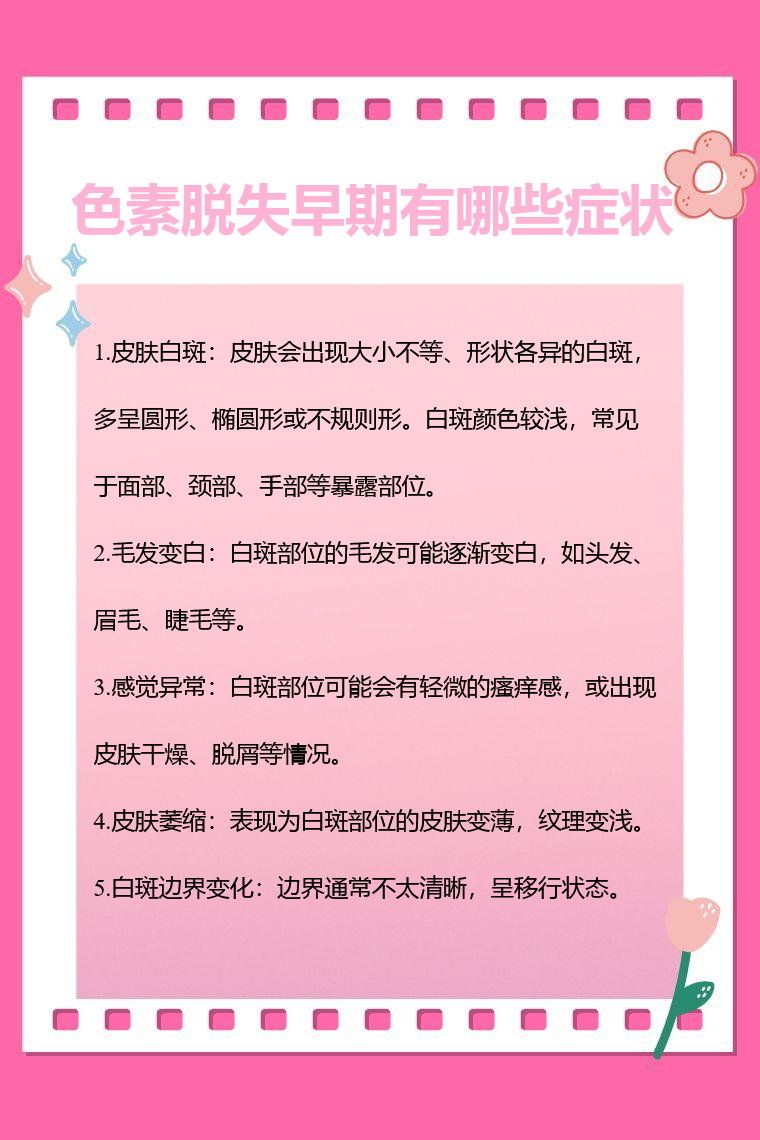 色素脱失早期症状有皮肤白斑、毛发变白、感觉异常、皮肤萎缩、白斑边界变化等。
