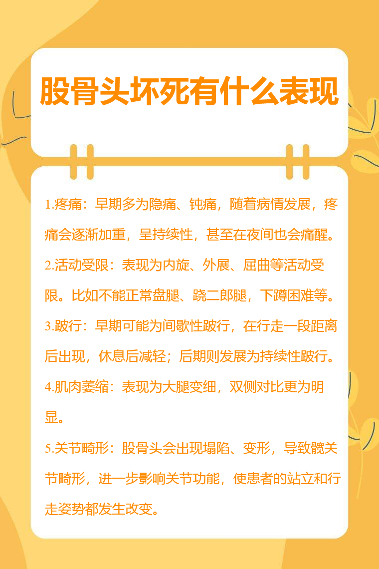 5.关节畸形:病情严重时,股骨头会出现塌陷、变形,导致髋关节畸形,进一步影响关节功能,使患者的站立和行走姿势都发生改变。