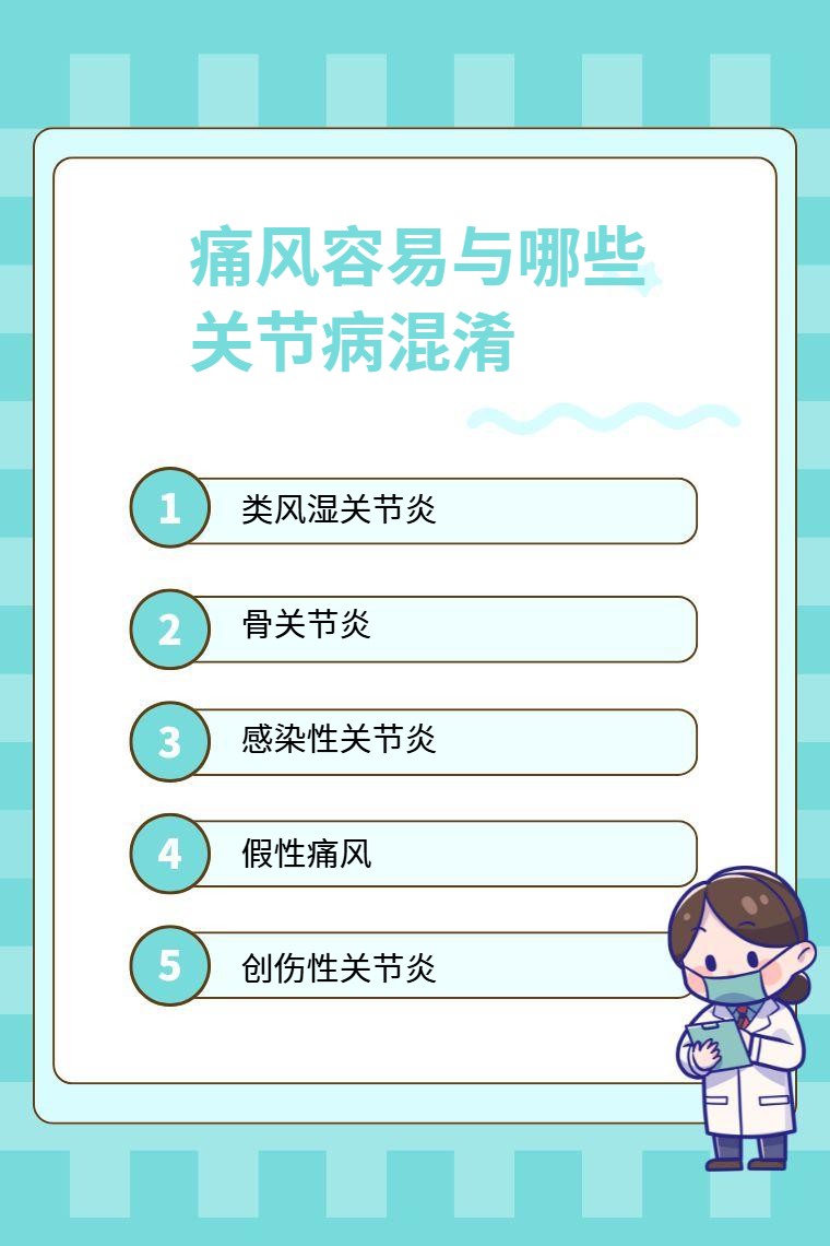 痛风容易与类风湿关节炎、骨关节炎、感染性关节炎、假性痛风、创伤性关节炎等混淆。