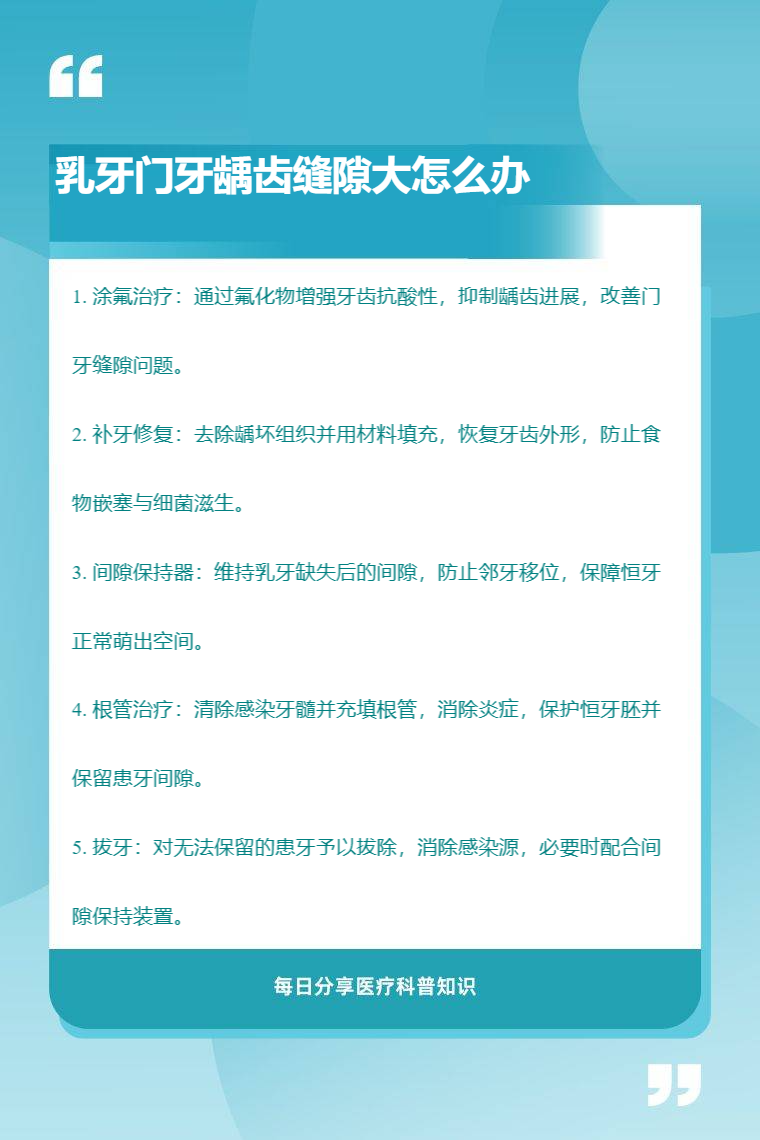 乳牙门牙龋齿缝隙大可以通过涂氟治疗、补牙修复、间隙保持器、根管治疗、拔牙等方法处理。