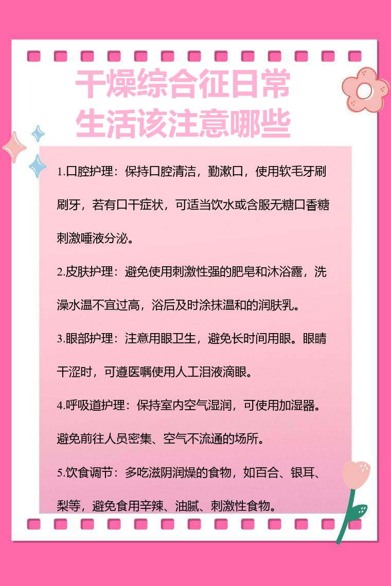 干燥综合征日常生活需注意口腔护理、皮肤护理、眼部护理、呼吸道护理、饮食调节等。