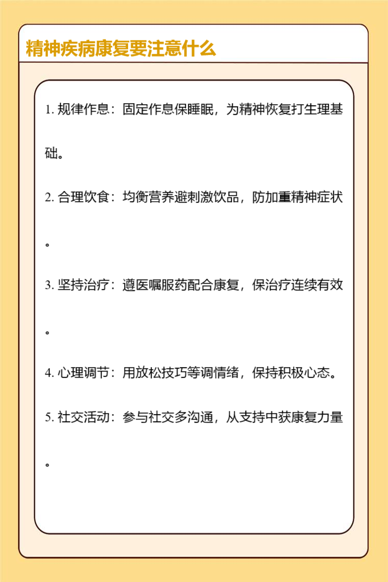 精神疾病康复要注意规律作息、合理饮食、坚持治疗、心理调节、社交活动等。