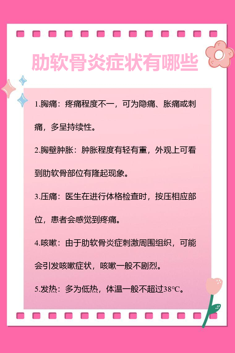 5.发热:少数情况下,肋软骨炎患者会出现发热症状,多为低热,体温一般不超过38℃,这可能与炎症反应有关。