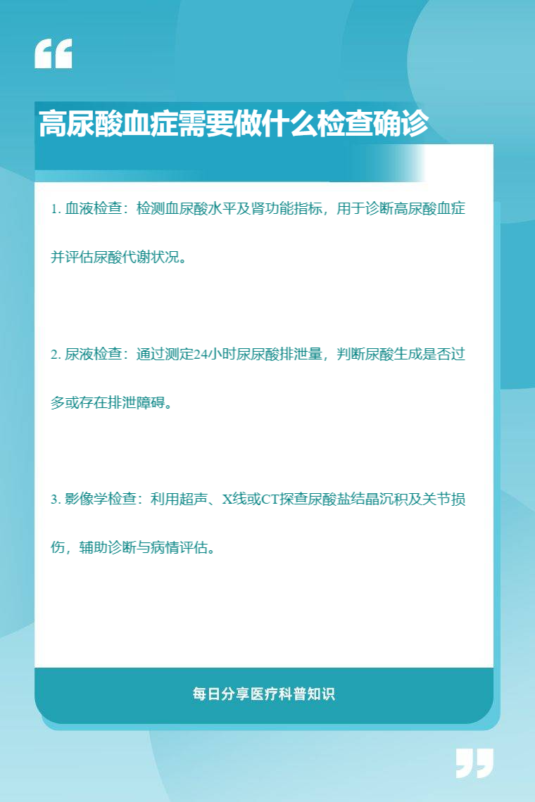 高尿酸血症的确诊通常需要进行血液检查、尿液检查、影像学检查等。