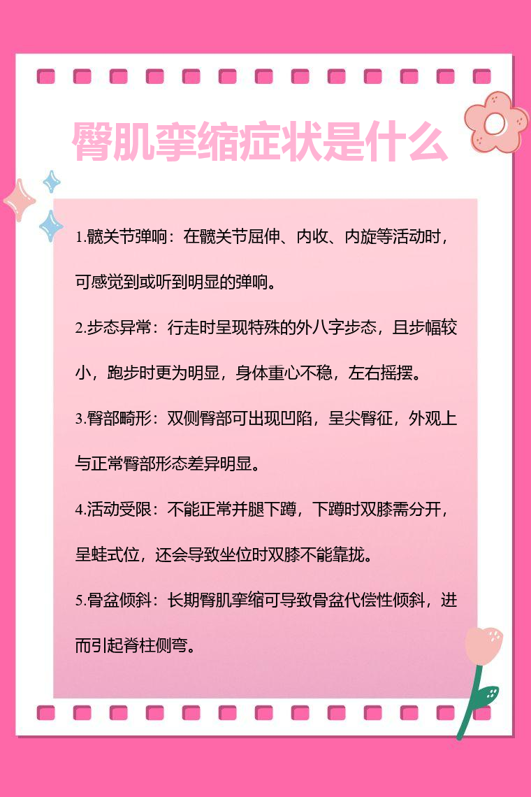 臀肌挛缩症状有髋关节弹响、步态异常、臀部畸形、活动受限、骨盆倾斜等。