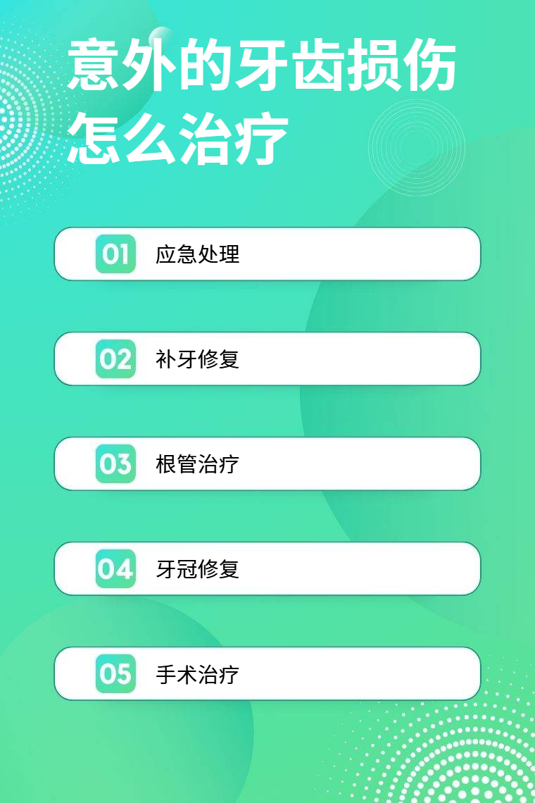 意外的牙齿损伤的治疗方法有应急处理、补牙修复、根管治疗、牙冠修复、手术治疗等。