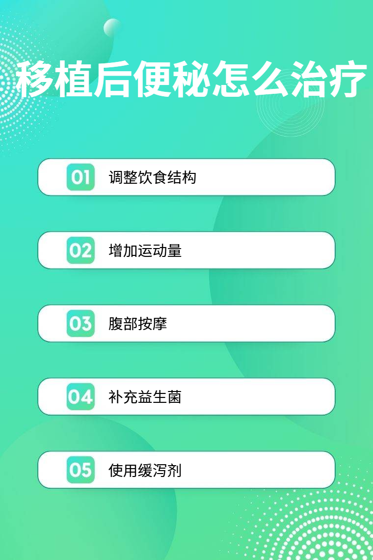 移植后便秘可通过调整饮食结构、增加运动量、腹部按摩、补充益生菌、使用缓泻剂等方法治疗。