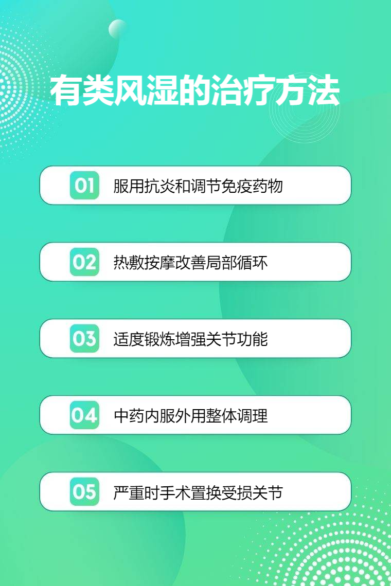 类风湿的治疗方法主要有药物治疗、物理治疗、康复训练、中医治疗、手术治疗等。