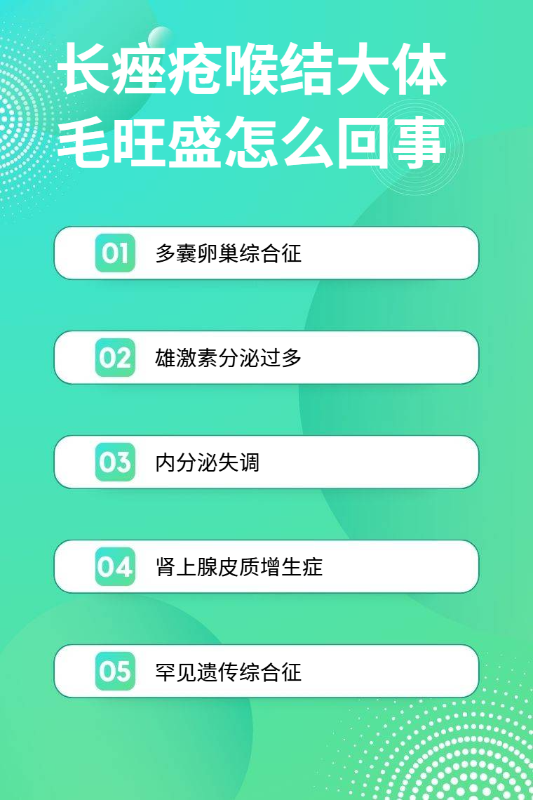 长痤疮、喉结大、体毛旺盛可能由多囊卵巢综合征、雄激素分泌过多、内分泌失调、肾上腺皮质增生症、罕见遗传综合征等引起。