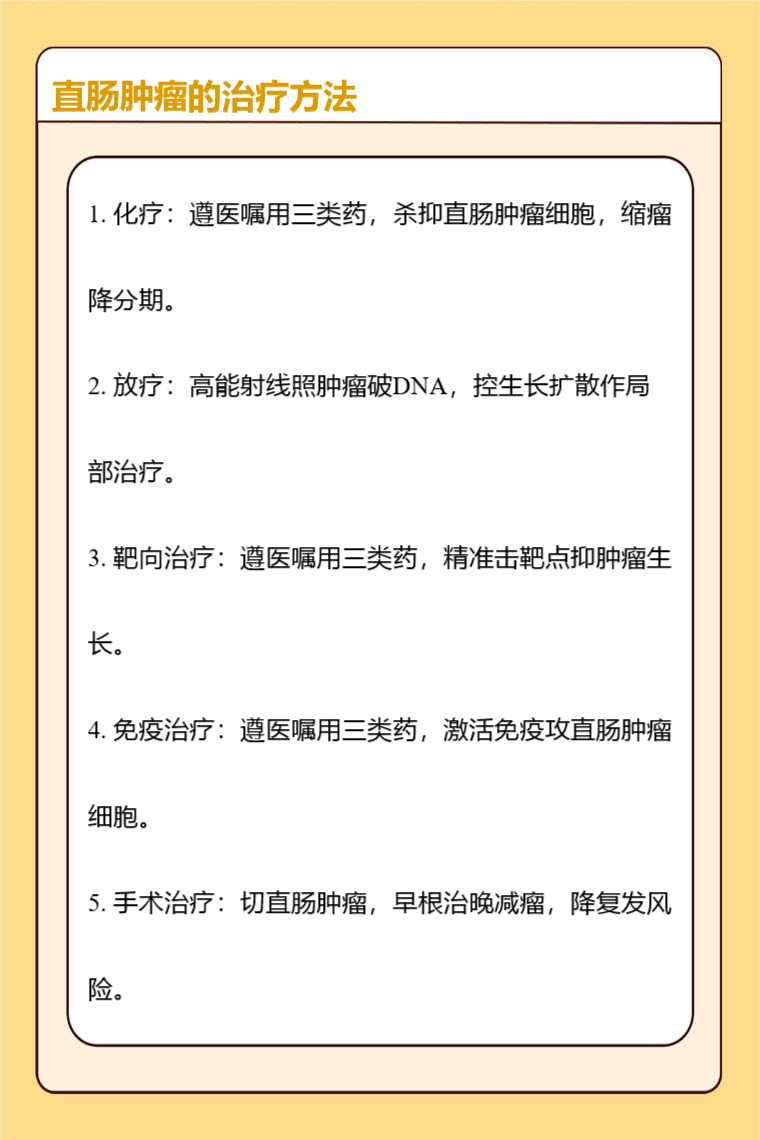直肠肿瘤的治疗方法主要有化疗、放疗、靶向治疗、免疫治疗、手术治疗等。
