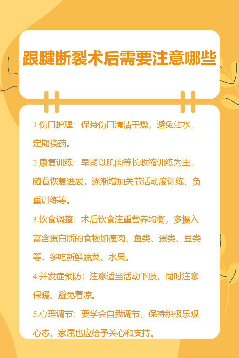 跟腱断裂术后需要注意伤口护理、康复训练、饮食调整、并发症预防、心理调节等。