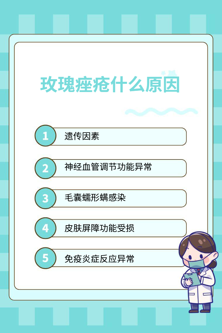 玫瑰痤疮的原因有遗传因素、神经血管调节功能异常、毛囊蠕形螨感染、皮肤屏障功能受损、免疫炎症反应异常等。