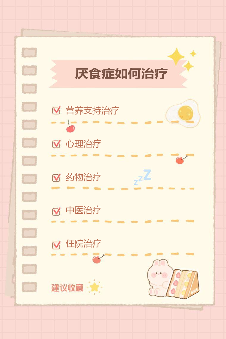 厌食症的治疗方法主要有营养支持治疗、心理治疗、药物治疗、中医治疗、住院治疗等。