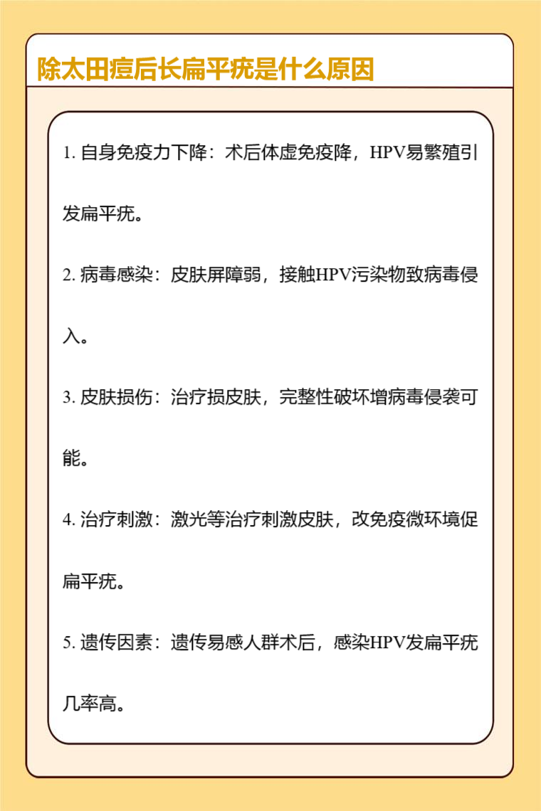 1. 自身免疫力下降:在去除太田痣后,身体可能处于相对虚弱的状态,免疫系统功能受到一定影响。此时,机体抵御外界病菌的能力降低,原本潜伏在体内的人乳头瘤病毒HPV容易趁机大量繁殖,从而引发扁平疣。比如一些患者在术后没有得到良好的休息和营养补充,导致免疫力迟迟无法恢复到正常水平,增加了感染风险。