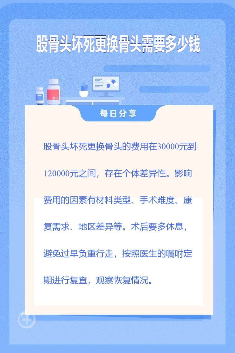 股骨头坏死更换骨头的费用在30000元到120000元之间,存在个体差异性。影响费用的因素有材料类型、手术难度、康复需求、地区差异等。