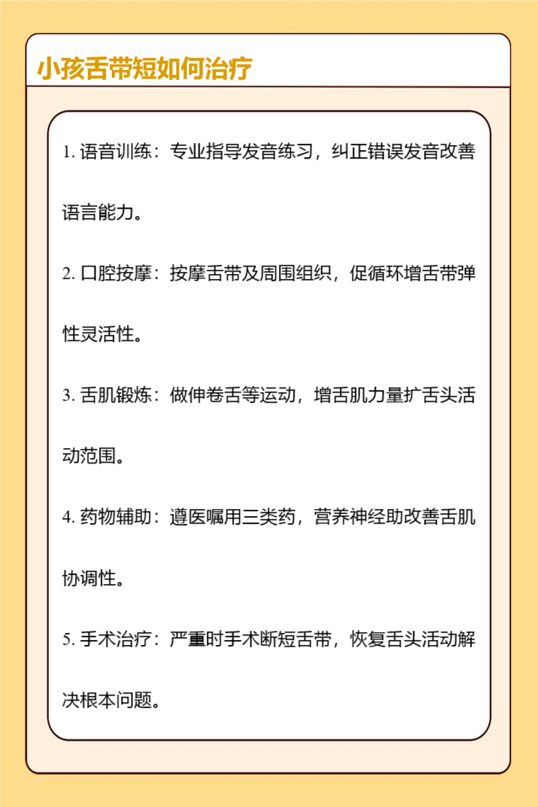 小孩舌带短的治疗方法有语音训练、口腔按摩、舌肌锻炼、药物辅助、手术治疗等。