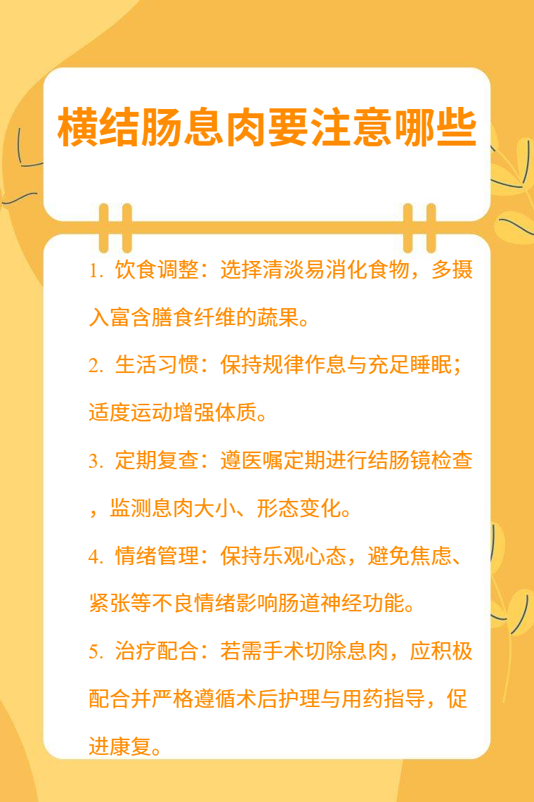 横结肠息肉患者要注意饮食、生活习惯、定期复查、情绪调节、治疗配合等。
