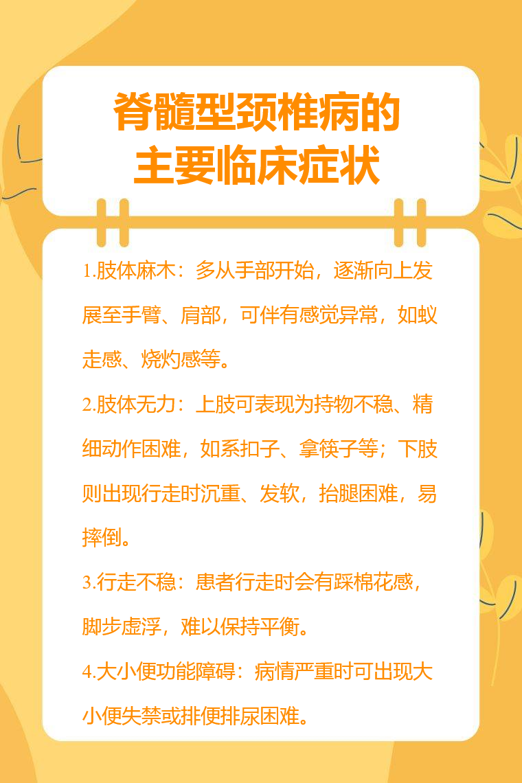 脊髓型颈椎病的主要临床症状包括肢体麻木、肢体无力、行走不稳、大小便功能障碍等。