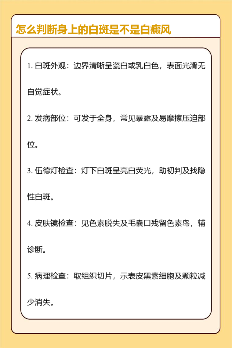 判断身上的白斑是不是白癜风可从白斑外观、发病部位、伍德灯检查、皮肤镜检查、病理检查等方面入手。