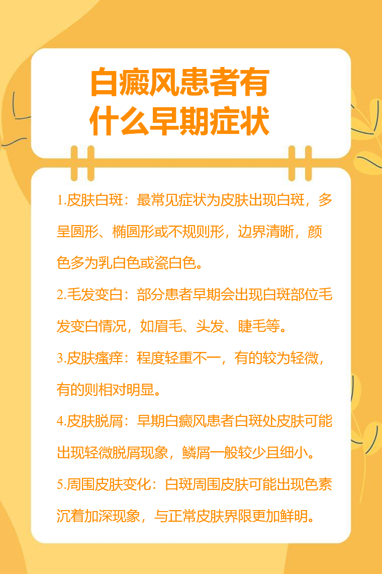 白癜风患者早期症状有皮肤白斑、毛发变白、皮肤瘙痒、皮肤脱屑、周围皮肤变化等。