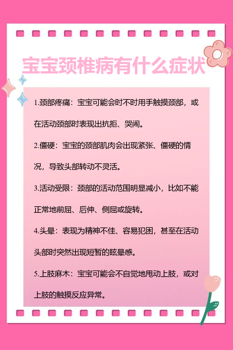 宝宝颈椎病的症状有颈部疼痛、僵硬、活动受限、头晕、上肢麻木等。