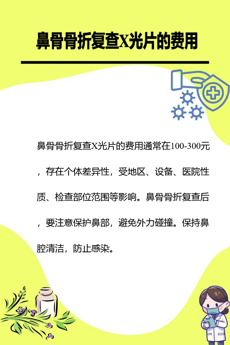 鼻骨骨折复查X光片的费用通常在100-300元,存在个体差异性,受地区、设备、医院性质、检查部位范围等影响。